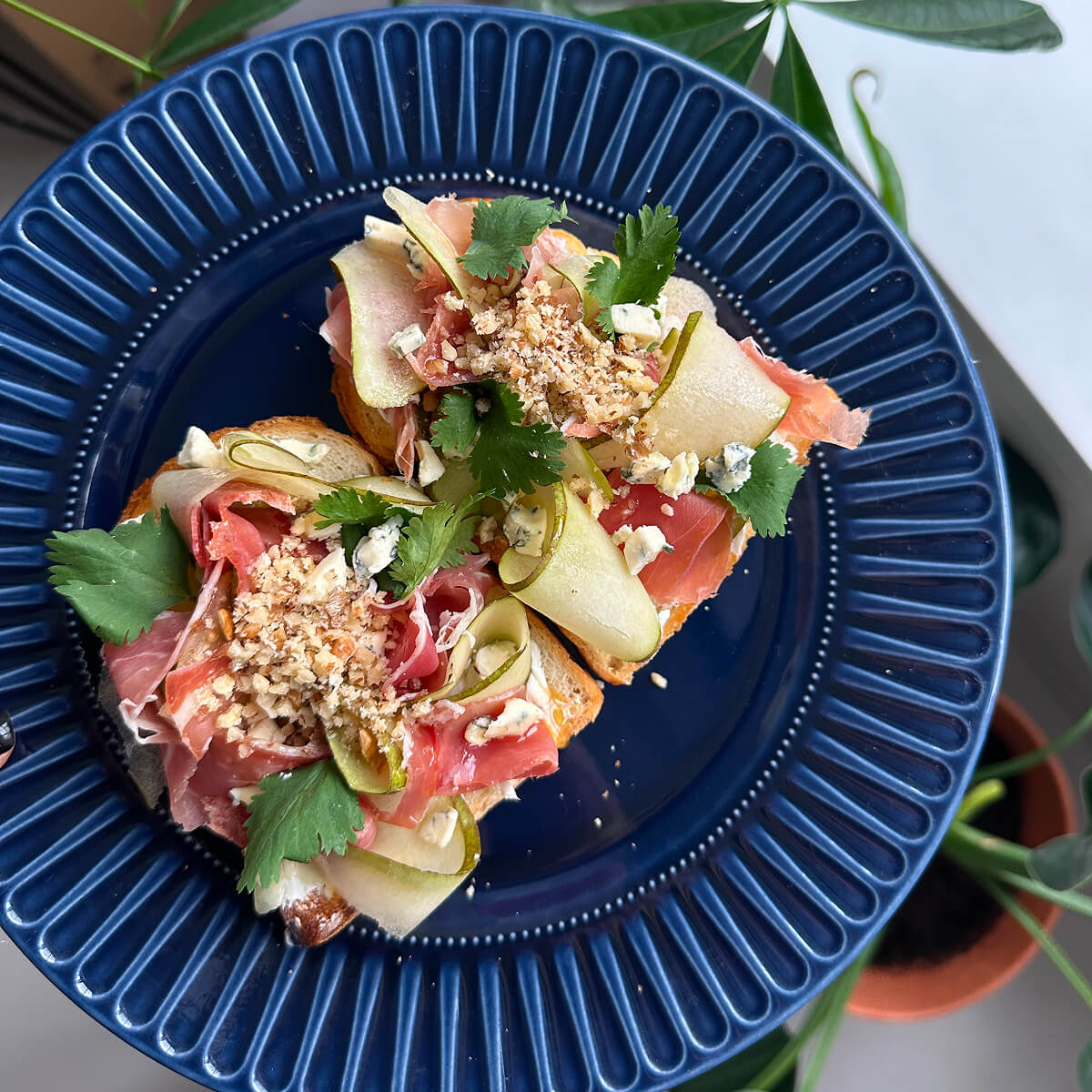 Это наше любимое блюдо из кафе Kalabasa. Назвать бутербродами даже язык не поворачивается, это произведение искусства. Я не могла пройти мимо этого блюда и повторила его мимо. Оно подходит не только для завтрака, можно подавать как закуску к вину или делать мини-брускетты на праздничный ужин. Прошутто в данных бутербродах можно не добавлять, тогда получится более нежное и легкое блюдо. Если вы не любите сыр дорблю, его можно заменить на мелко тертый пармезан.